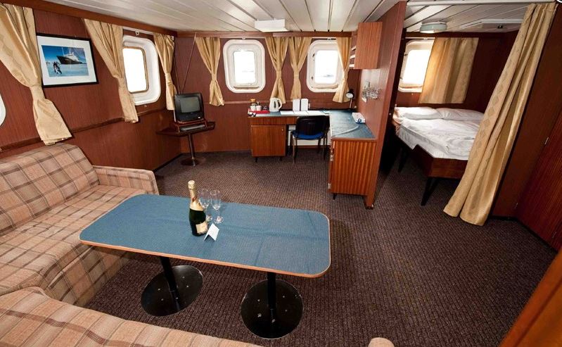 The ship is well equipped for a research vessel and comes with a sauna, lecture theater, bar/lounge, dining room and well stocked polar library. Te surrounding deck has great space for viewing and the Russian captain is incredibly experienced at navigating the cold waters around the peninsula.